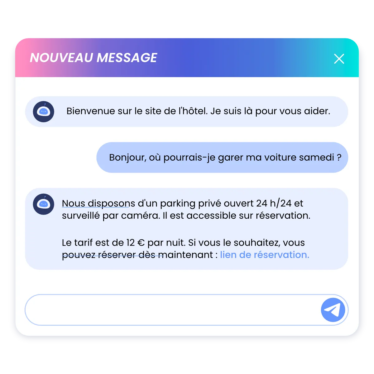 Ne perdez plus aucune demande de réservation. Nos solutions d'intelligence artificielle conversationnelle répondent instantanément aux questions de vos visiteurs sur votre site web (chatbot) ou par téléphone (callbot), même en dehors de vos horaires d'ouverture. Disponibilité, tarifs, équipements, disponibilités : l'IA qualifie les demandes et transmet les opportunités de réservation à votre équipe. Le complément idéal de Google Ads pour convertir 100 % du trafic généré.